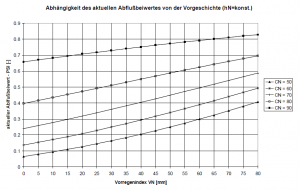 Bei Angabe eines vom Bodentyp und der Bodennutzung abhängigen CN-Wertes (siehe /DVWK, 1991/) lässt sich ein vorgeschichtsabhängiger Anfangsverlust sowie eine vorgeschichtsabhängige Beziehung des Abflussbeiwertes von der bis zum betrachteten Zeitpunkt akkumulierten Niederschlagshöhe formulieren /Zaiss, 1987/; d.h. der Abflussbeiwert wächst mit zunehmendem Niederschlag im Verlauf des Ereignisses an. Die Quantifizierung der Vorgeschichte erfolgt über den 21-Tage-Vorregenindex [math]\displaystyle{ VN }[/math]