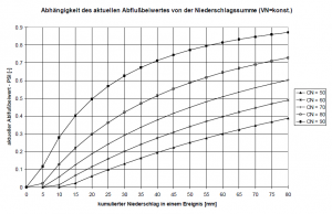Da sich im Verlaufe eines Regenereignisses durch die Durchfeuchtung des Bodens die Abflussbereitschaft eines Einzugsgebiets verändert, wird ebenfalls eine Anpassung des Abflussbeiwertes während eines Ereignisses als Funktion der kumulierten Niederschlagshöhe vorgenommen.