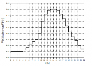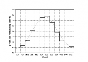 Die jährliche potentielle Gesamtverdunstungshöhe beträgt 642 mm. Liegen keine gemessenen Verdunstungswerte vor, kann optional dieser normierte Jahresgang der potentiellen Verdunstung für die Berechnung der aktuellen Verdunstung herangezogen werden. Ist das gewählte Berechnungszeitintervall kleiner als ein Tag, wird mittels des dargestellten Tagesgangs letztendlich die potentielle Verdunstung für jedes Berechnungszeitintervall ermittelt. Ist das Berechnungsintervall ≤ 1 Tag entfällt die Berücksichtigung des Tagesganges.